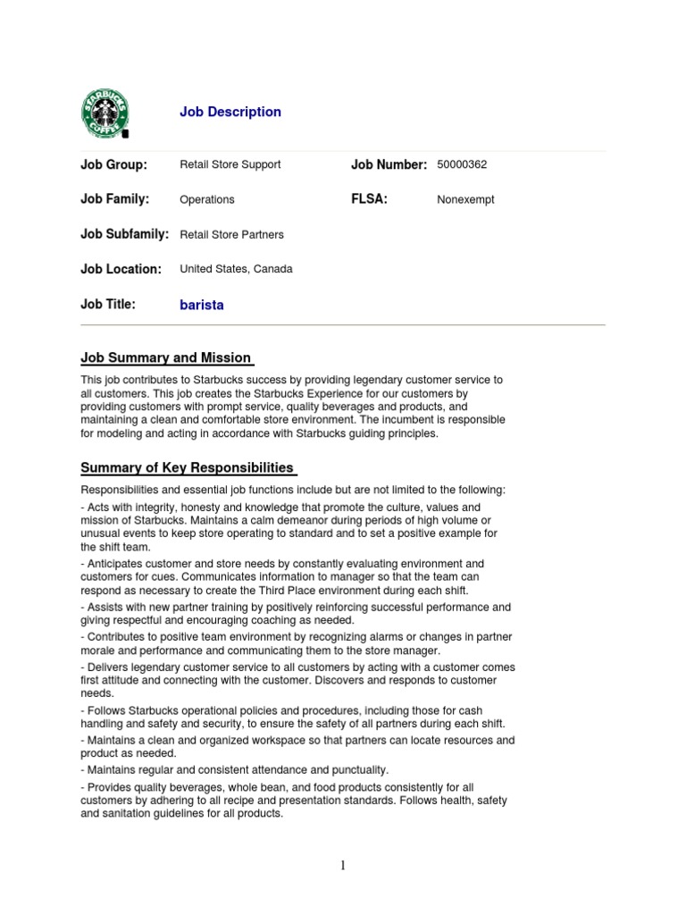 Prepare beverages for the customers, such as tea and coffee. Myperfectresume.com has been visited by 100k+ users in the past month Create a professional resume in just 15 minutes, easy Here is how the starbucks barista job description resume looks like: Starbucks baristas and other employees get the best perks in the industry. What kind of resume do you need for barista? They also operate cash registers and machines. A starbucks barista also maintains and cleans the store. Counted cash in register drawer at beginning and end of shift. What's the job description for a barista at starbucks? Starbucks baristas perform several job duties and provide customer service. Resume.io has been visited by 100k+ users in the past month Check out real resumes from actual people.